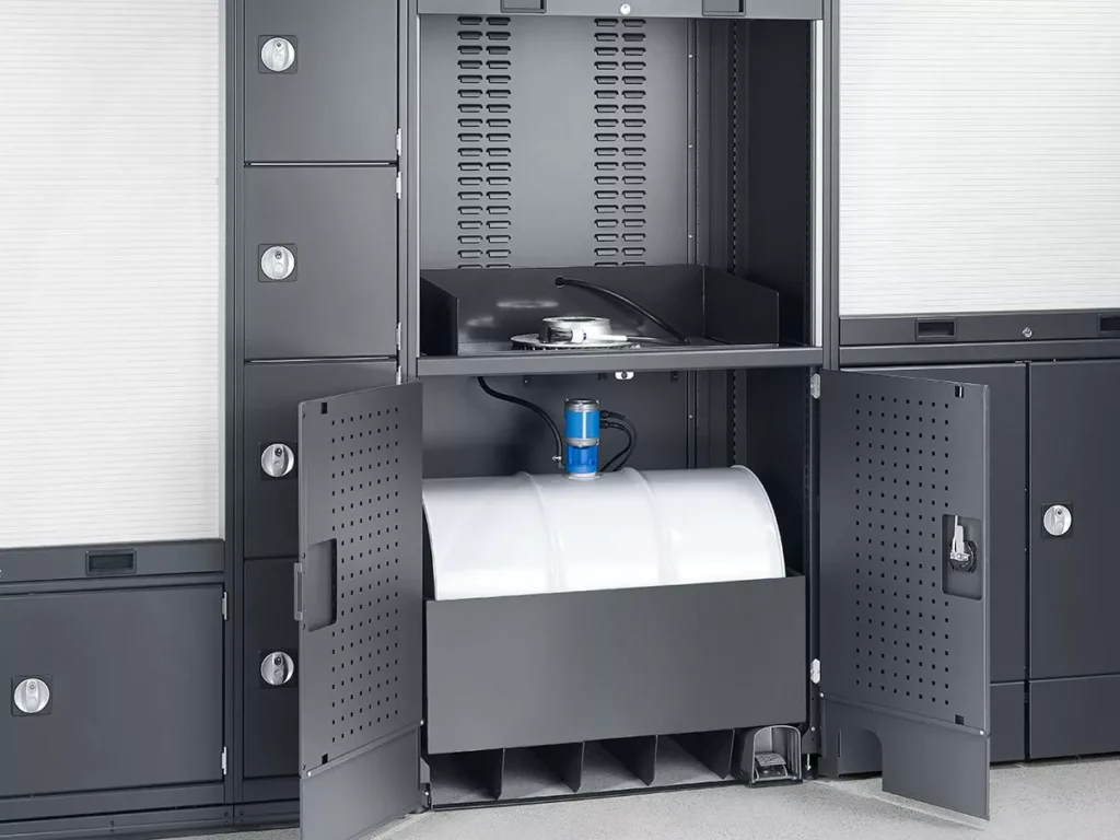 - Stauraum für Behälter mit Reinigungsflüssigkeit inkl. Staplersockel zum einfachen Austausch der Fässer.