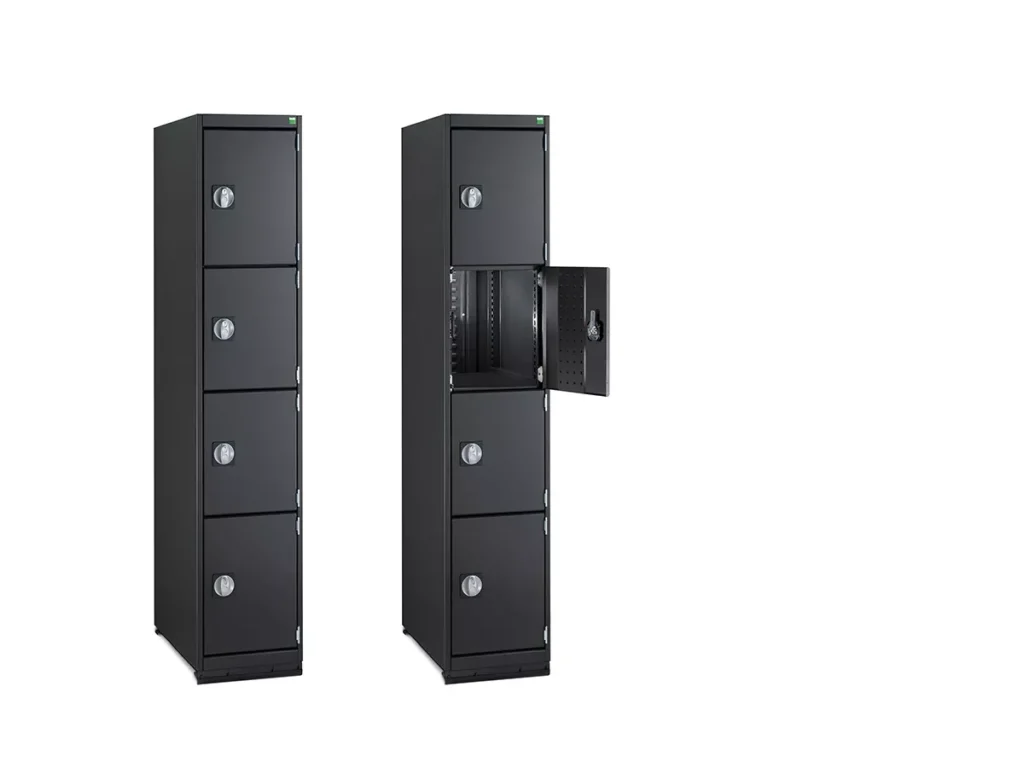 - Schrank mit Rollladen oben und Flügeltüren unten, Innenseite mit perfo Lochung.
