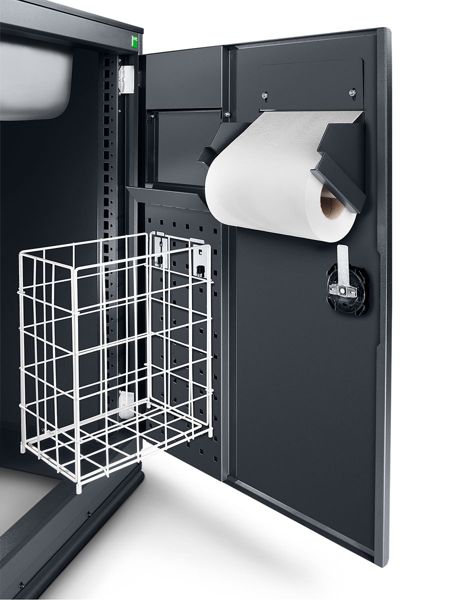 - Je nach Ausführung mit integriertem Papierrollenhalter und Papierkorb.