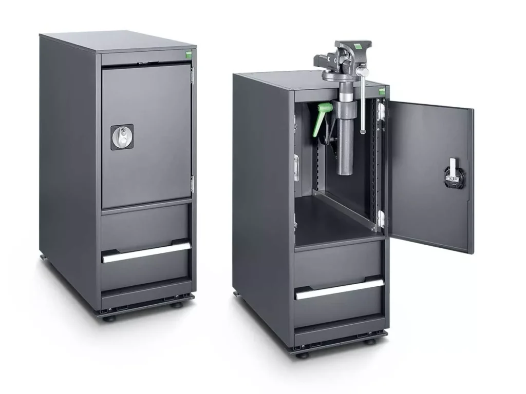 - Bei Nichtgebrauch verschwindet der Schraubstock hinter der verschließbaren Flügeltür.